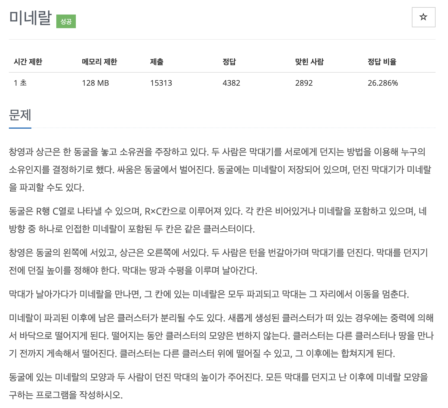 1. 문제 이 문제는 그래프 탐색을 기반으로 한 구현문제이다.동굴의 미네랄을 파괴하며 클러스터가 분리되면새롭게 생성된 클러스터를 아래로 떨어뜨리는 문제이다. 2. 풀이 문제를 이해하기 위해서 해야 하는 일을 순서대로 정리해보았다. 1. 동굴 입력 받기2. 높이와 막대 던지는 방향 확인해서 미네랄 파괴하기3. 파괴된 미네랄 주변 클러스터 분리 여부 확인하기4. 분리된 클러스터를 아래로 떨어뜨리기5. 2 ~ 4번 반복하기6. 최종 미네랄 모양 출력하기 1. 동굴 입력 받기동굴을 char[][] 배열로 입력 받는다.'x'는 미네랄이고 '.'은 빈 공간이다. 2. 높이와 막대 던지는 방향 확인해서 미네랄 파괴하기가장 아래가 1층이므로 높이 h가 주어졌을 때 r - h로 해당 층 좌표를 구할 수 있다.던지는 방..
