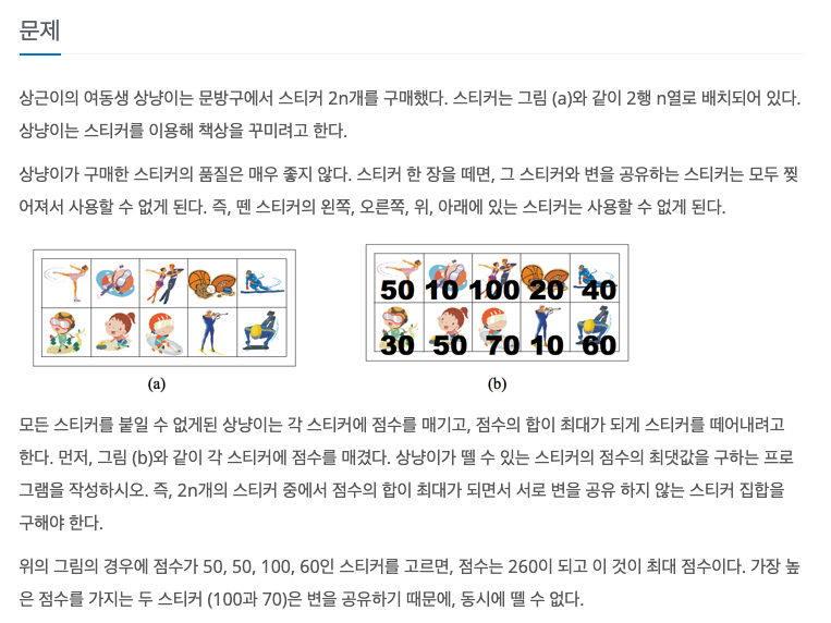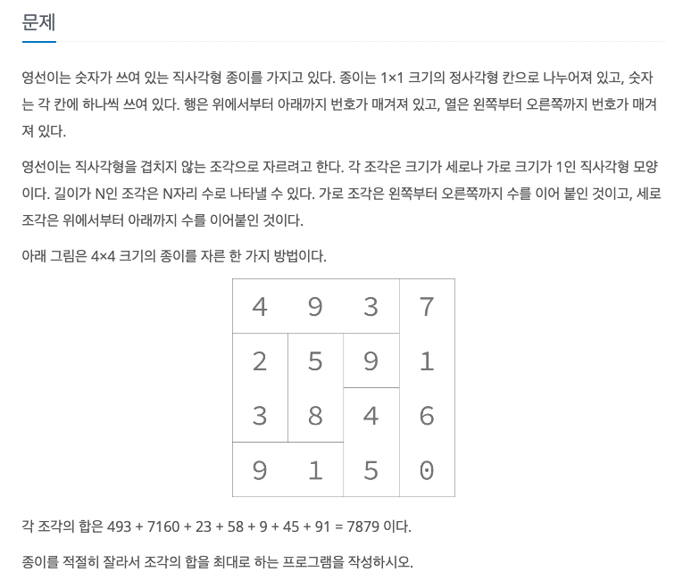 1. 문제 이 문제는 직사각형 종이를 한 변이 1인 직사각형 모양의 조각으로 잘라서조각 안의 수를 왼->오, 위->아래로 붙인 수의 합을 최대로 만드는 프로그램을 짜는 문제이다.특이점은 종이의 크기가 최대 4*4로 작다는 점이다.2. 풀이이 문제는 다양한 시도를 했으나 그만큼 실패를 많이 경험했다.처음에는 단순히 생각해서 그냥 가로로 쭉 자른 종이들의 합, 세로로 쭉 자른 종이들의 합,이 두 값을 비교해서 큰 값으로 하면 되잖아? 라고 생각했다.왜냐면 종이를 쭉 이어서 자르지 않고 막 조각내면 자릿수가 작아지니까.근데 이건 잘못된 생각이었다.문제에서 나온 예시와 달리 '0'이 들어가는 경우에 이상한 상황이 생긴다. 예를 들어서, 아래와 같은 종이조각 말이다.0023001299990011 1. 가로로 쭉 ..